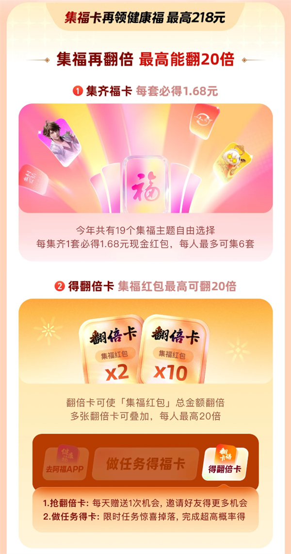 此外,用户还有机会抽取2倍和10倍翻倍卡,所有集福红包统一在除夕夜22:18开奖。