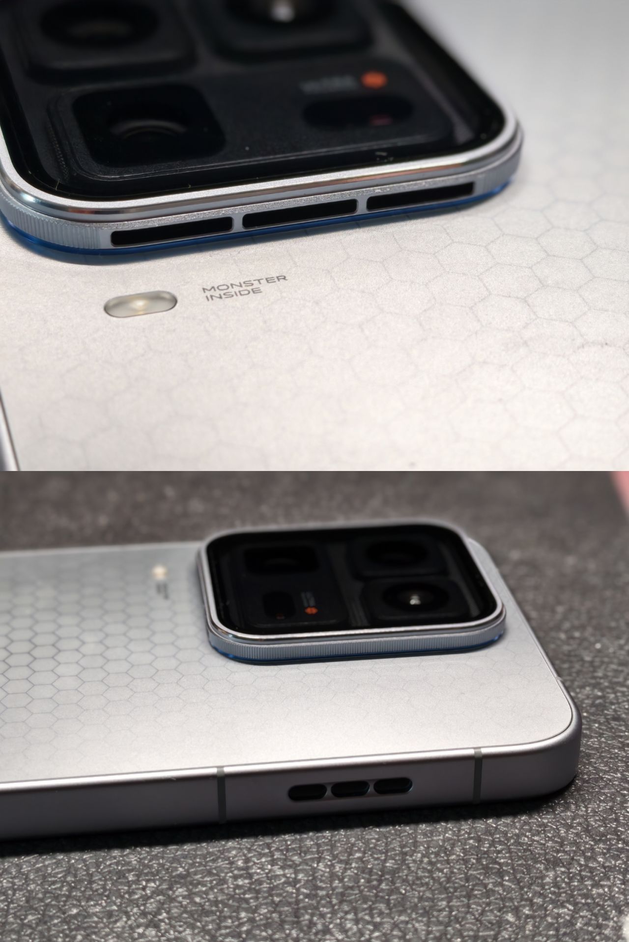 这次我个人买的是个银色,不过不管黑色还是银色,手机的后盖背板采用的都是玻纤材质,并且还有六边形的蜂窝处理,科技感满满