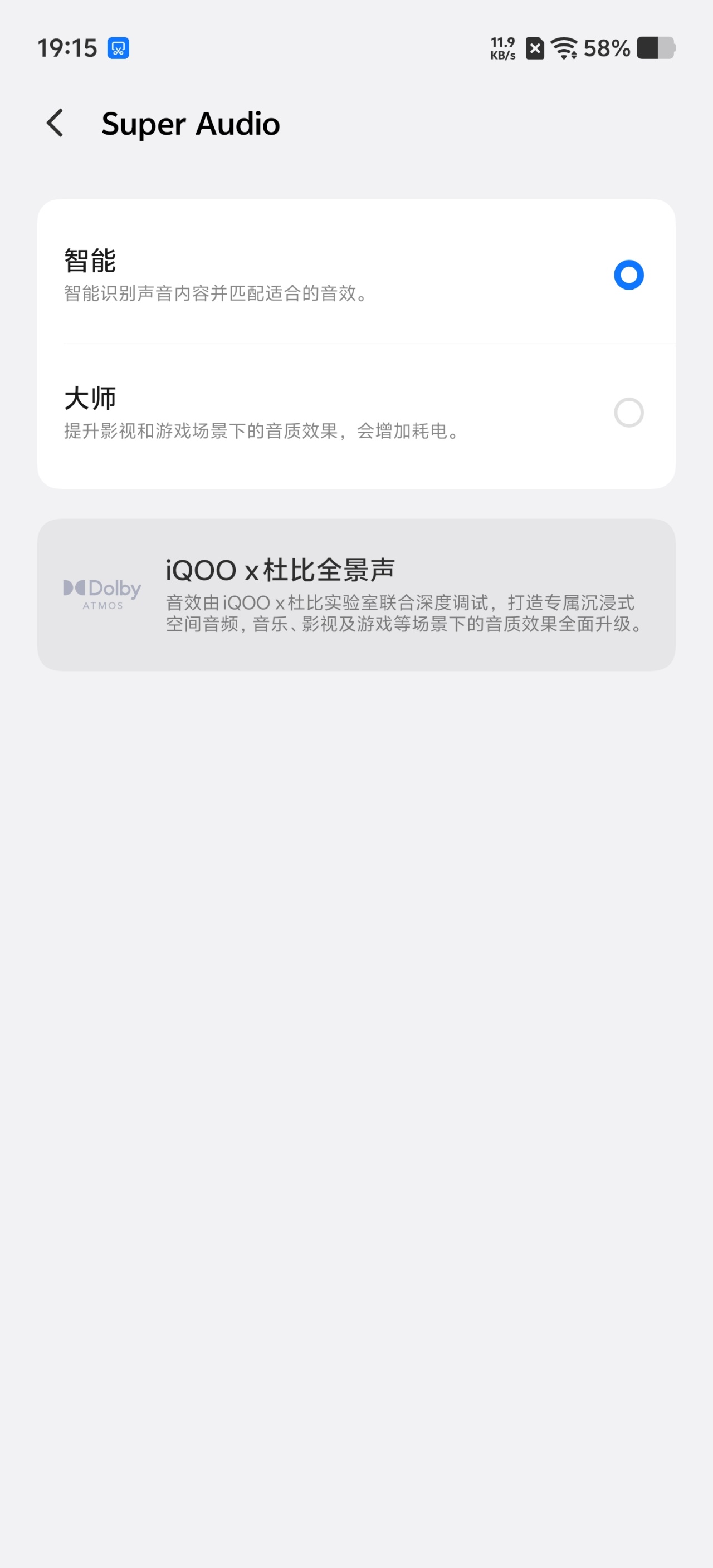 这个是iQOO15没有的,在设置——声音——音质音效里面可以找到,这里是有明显标注,支持杜比全景声的,而iQOO15没有显示
