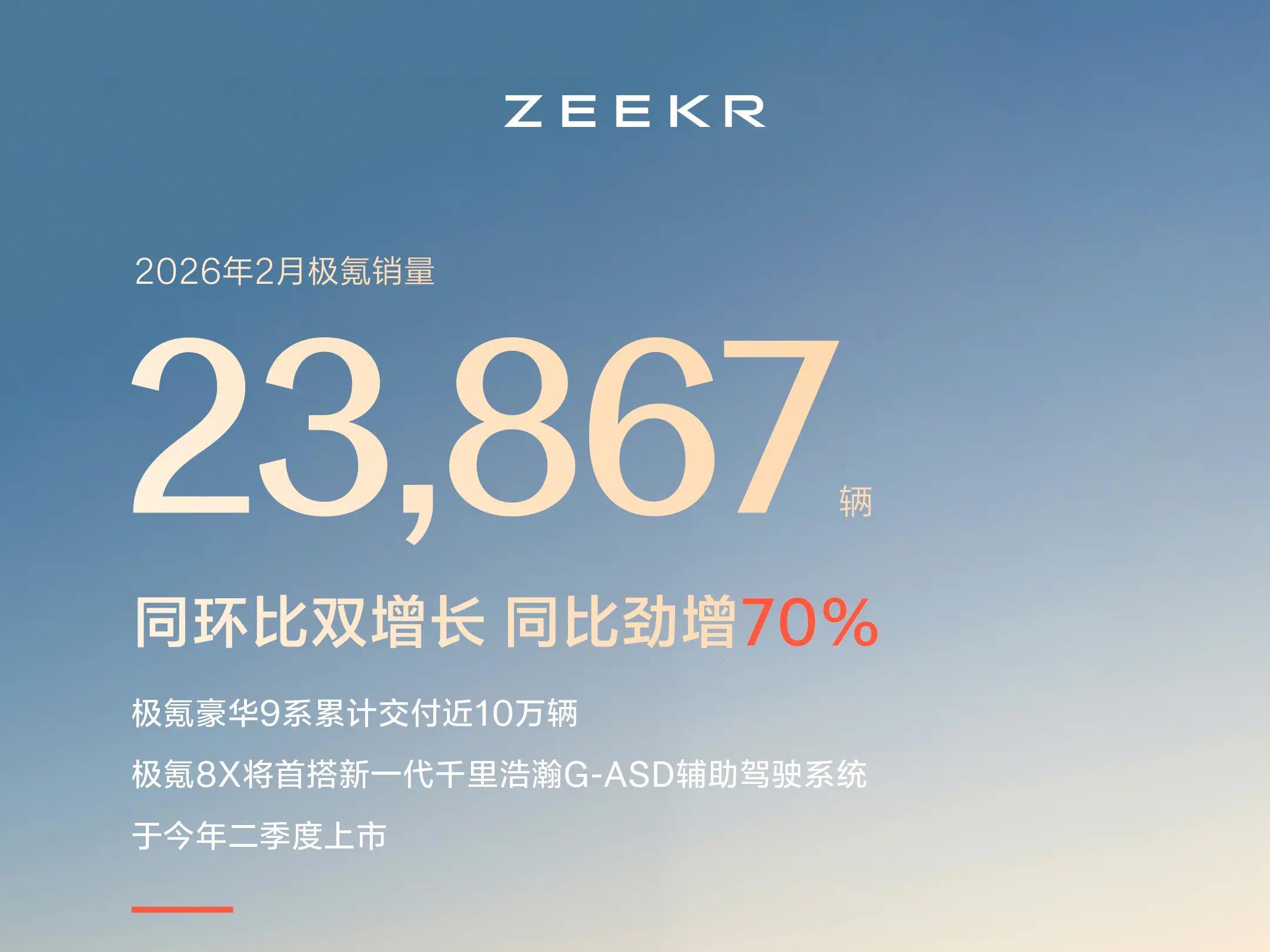 2月份极氪品牌交付了新车23867辆,同比增长70%,环比1月份也有小幅增长。极氪9X与极氪7X依旧是家族中的销量担当,其中,极氪9X的成交均价超过了53万,在中高端市场展现出强劲的号召力,部分版本仍是一车难求,比如高配的Hyper版本交付周期仍是超过了14周,此外,极氪8X也将于第二季度正式上市,这将会对极氪品牌的销量增长带来助推作用。