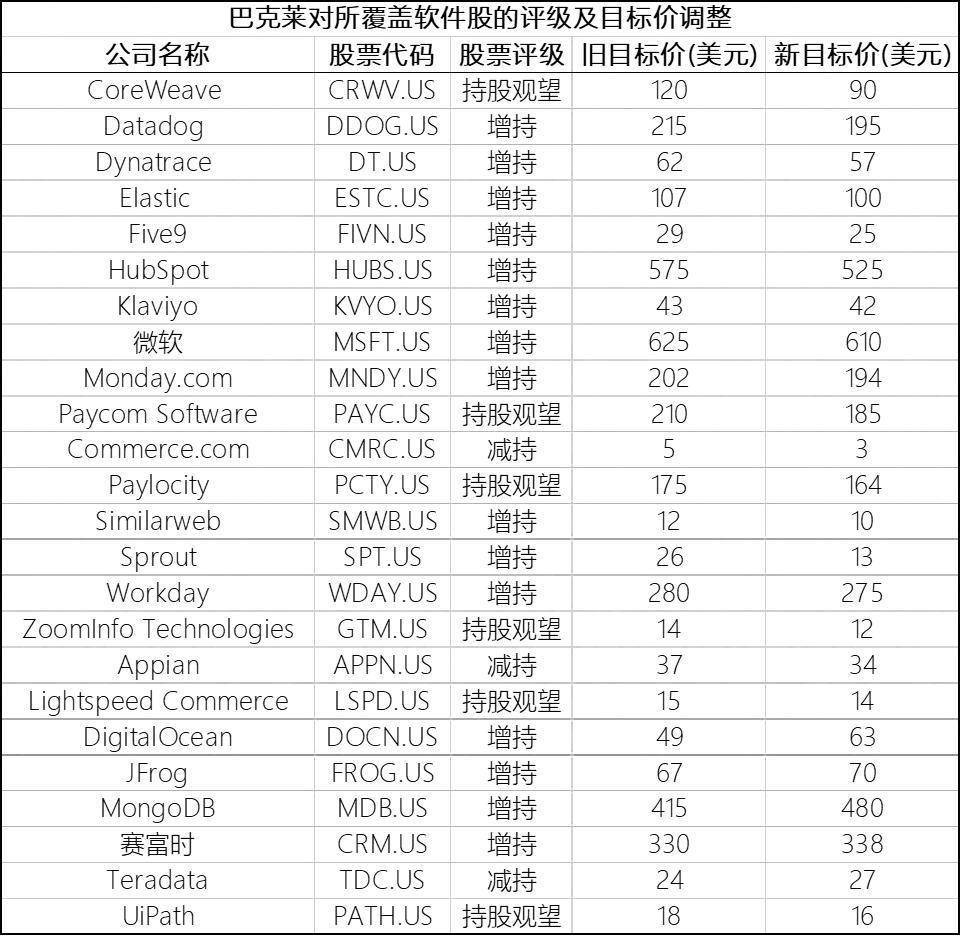 巴克莱分析师团队指出,其看好的年度优选个股是赛富时(CRM.US)、甲骨文(ORCL.US)和DigitalOcean(DOCN.US)。该行上调了笛卡尔物流系统集团(DSGX.US)的评级,同时下调了Snowflake(SNOW.US)、DoubleVerify(DV.US)和GitLab(GTLB.US)的评级。分析师还着重说明了调整上述几只软件股评级的理由。